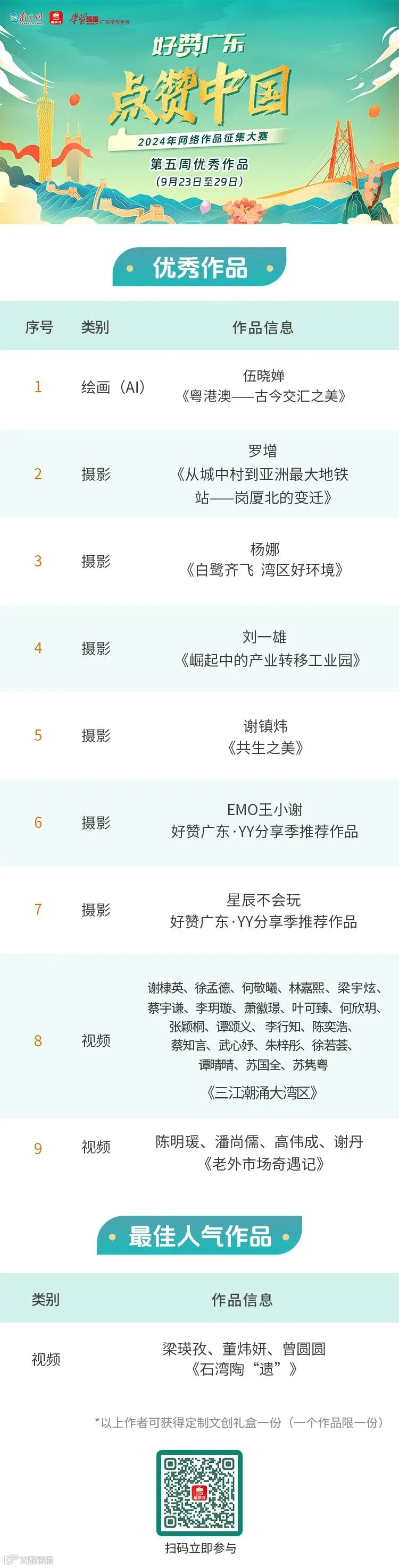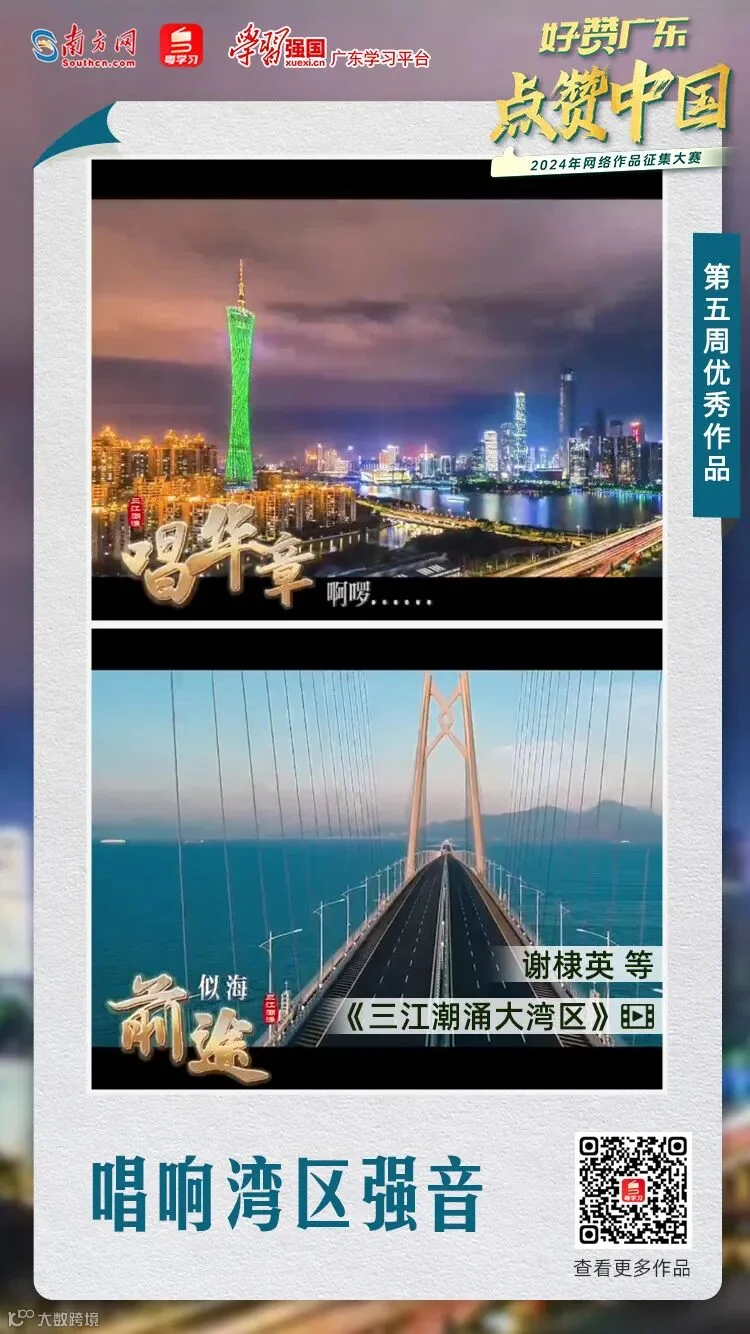湾区共融,再创新篇。让我们一同感受粤港澳大湾区包容与创新的独特魅力。以上展示的作品全部来自“好赞广东·点赞中国”2024年网络作品征集大赛第五周优秀作品,大赛自8月1日上线以来获得了广大网友的热烈支持和积极参与。经过评审小组的多轮次筛选,本周共评出优秀作品9个和最佳人气奖1个,均可获得精美礼品一份(一个作品限一份)。