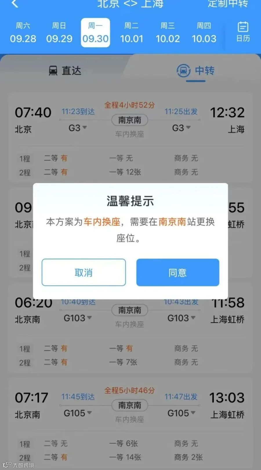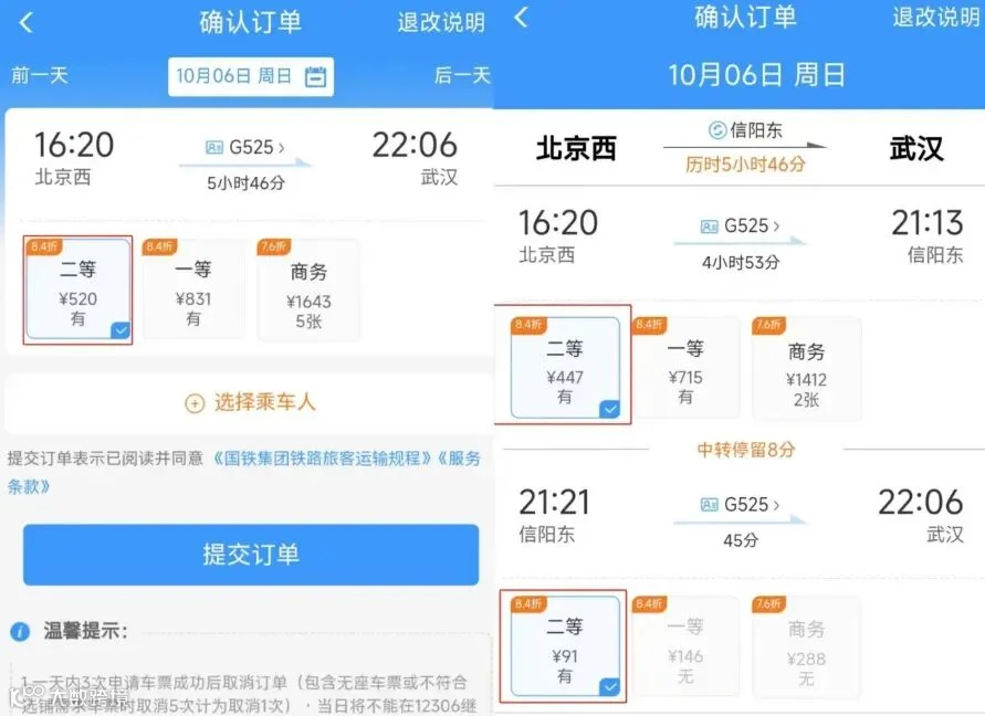 以10月6日从北京西站发往武汉站的G525次列车为例:直达票价二等座为8.4折,520元;车内换座方案分为北京西站到信阳东站、信阳东站到武汉站两部分,二等座价格也是8.4折,分别为447元和91元,共538元,比直达票高18元。