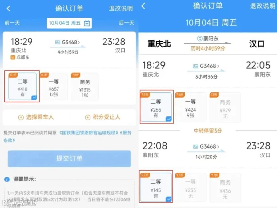 而10月4日从重庆北站出发到汉口站的G3468次列车的折扣则有所不同:直达票二等座为8.1折,410元;车内换座方案分为重庆北站到襄阳东站、襄阳东站到汉口站,前者二等座票价7.5折、265元,后者9.7折,145元,合计410元,与直达票价相同。