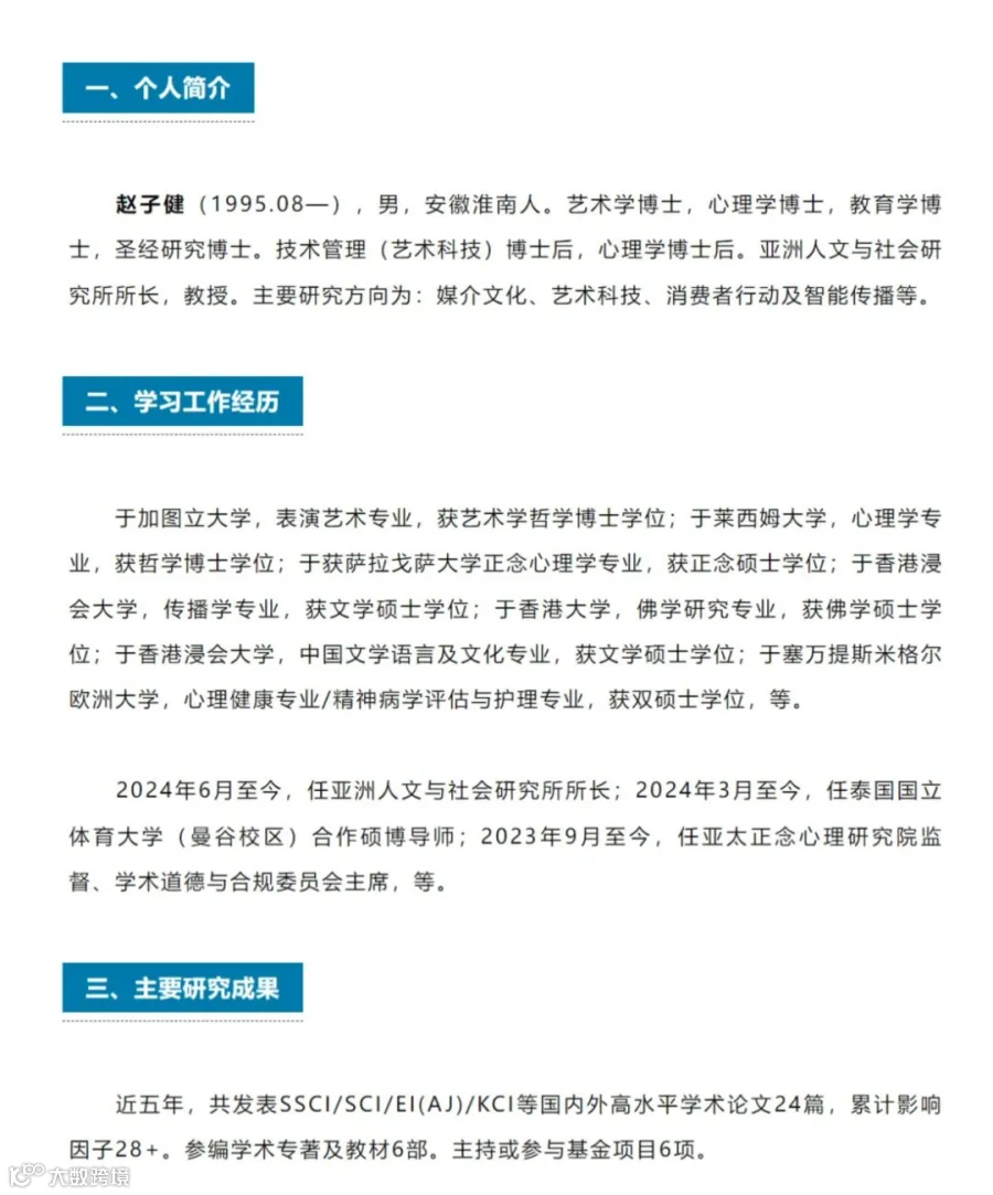 此外,官方简历还介绍称,赵子健于2023年9月至今任亚太正念心理研究院监督、学术道德与合规委员会主席,2024年3月至今任泰国国立体育大学(曼谷校区)合作硕博导师,2024年6月至今任亚洲人文与社会研究所所长。近五年,其共发表SSCI/SCI/EI(AJ)/KCI等国内外高水平学术论文24篇,累计影响因子28+,参编学术专著及教材6部,主持或参与基金项目6项。
