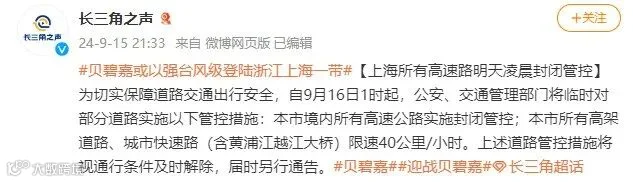 为切实保障道路交通出行安全,自9月16日1时起,公安、交通管理部门将临时对部分道路实施以下管控措施:本市境内所有高速公路实施封闭管控;本市所有高架道路、城市快速路(含黄浦江越江大桥)限速40公里/小时。上述道路管控措施将视通行条件及时解除,届时另行通告。