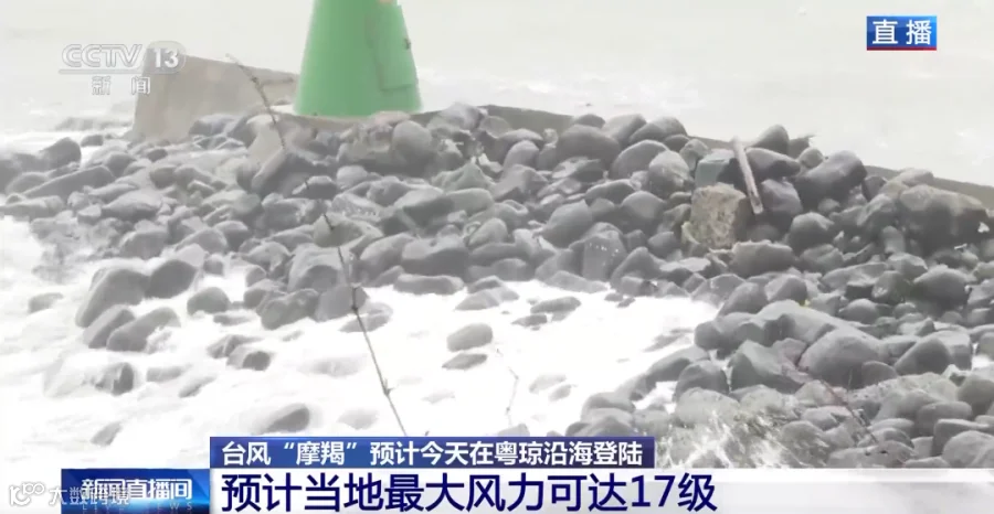 6日,受台风“摩羯”影响,广东徐闻海边风力约有9级,海浪最高超过6米,预计未来风浪还会加大。“摩羯”掀起的海浪,将2吨重的挡浪石,直接冲到海堤之上。