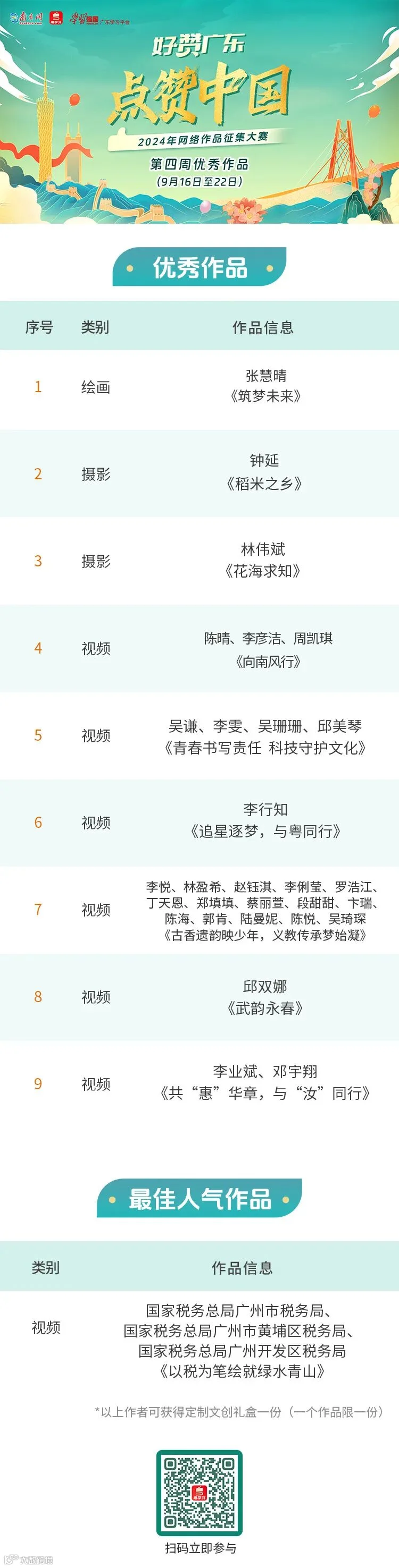 青春在奋斗中绽放,梦想指引着前行的道路,让我们一起“粤”动青春向未来。以上展示的作品全部来自“好赞广东·点赞中国”2024年网络作品征集大赛第四周优秀作品,征集大赛自8月1日上线以来获得了广大网友的热烈支持和积极参与。经过评审小组的多轮次筛选,本周共评出优秀作品9个和最佳人气奖1个,均可获得精美礼品一份(一个作品限一份)。