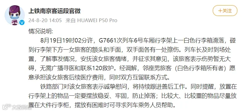 客运段官微 就此事发布情况说明,称该旅客表示伤势无大碍,行李箱所有者愿意承担其后续医疗费用。