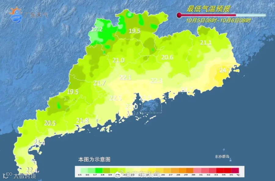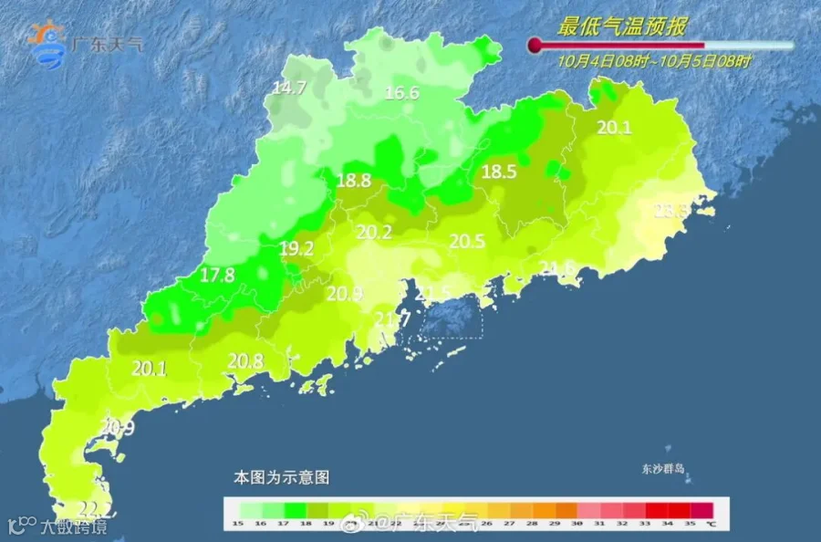 最低气温:粤北14~17℃,南部市县20~22℃,其余市县17~20℃。