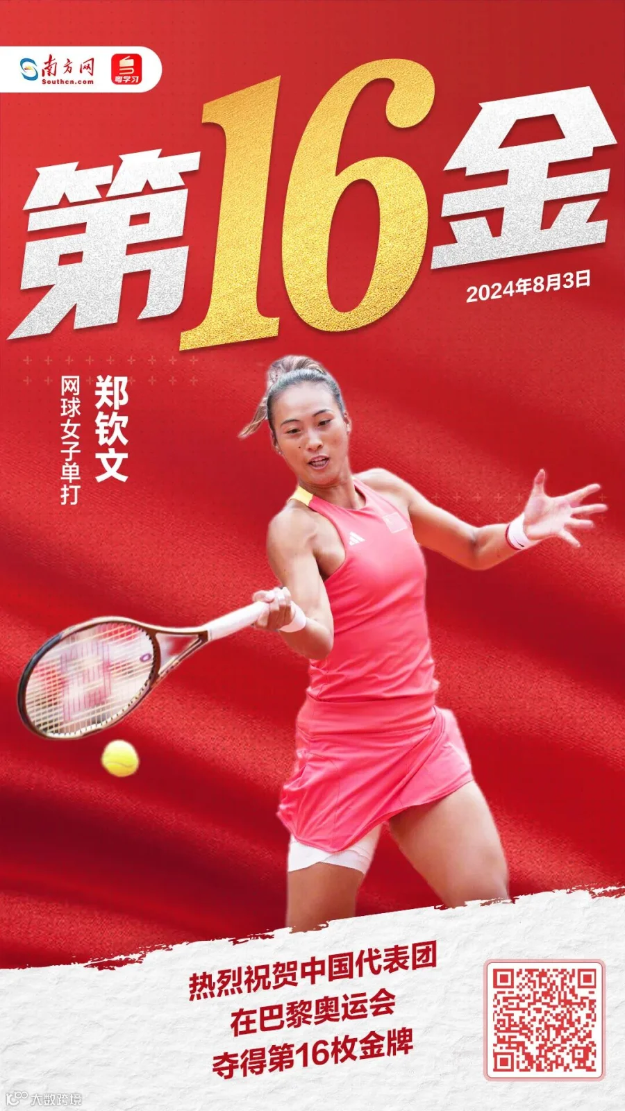 这是中国代表团在本届奥运会上的第16枚金牌,还是中国网球史上首次夺得该项目的金牌。