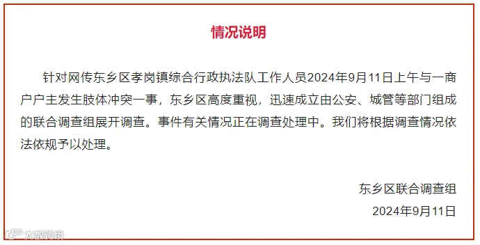 9月11日,东乡区联合调查组发布情况说明称,事件有关情况正在调查处理中。全文如下: