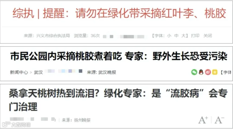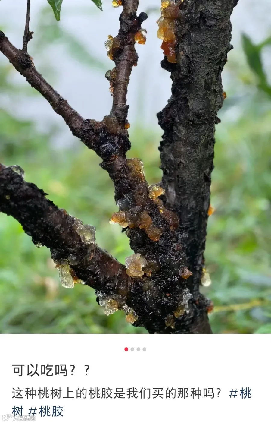 市园林科学研究院植物保护研究所高级工程师董立坤接受采访时表示,这种流胶不建议采食,一是因为雨后潮湿,会有很多霉菌感染;二是园林养护喷洒农药有可能污染。