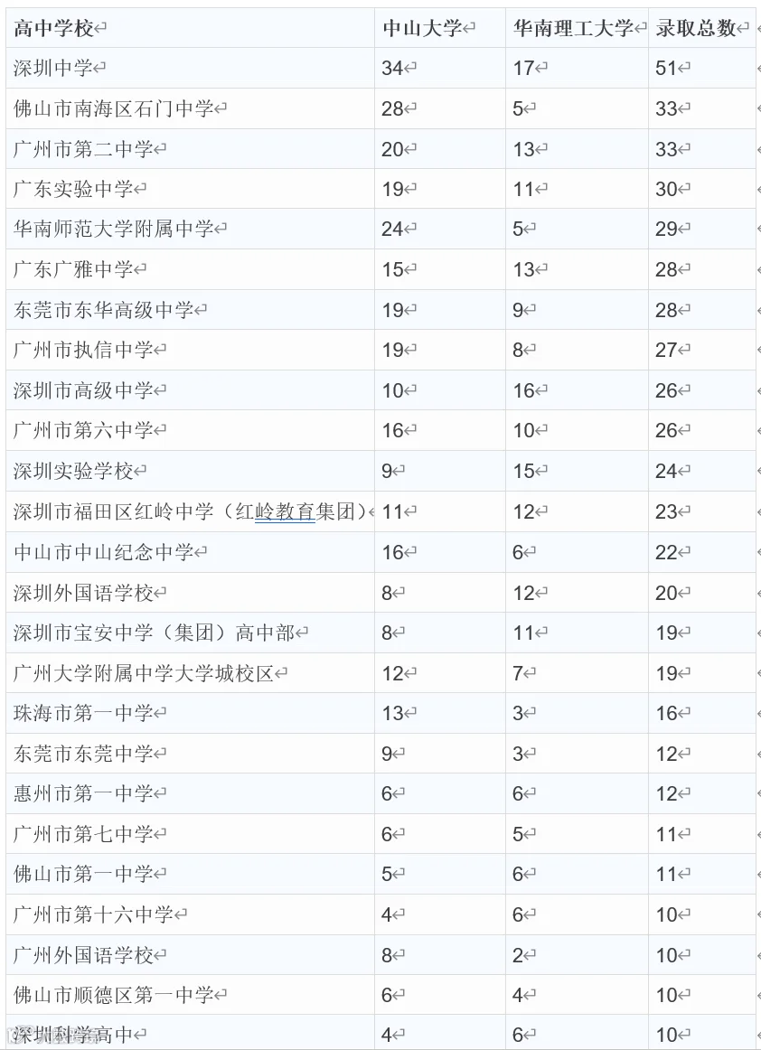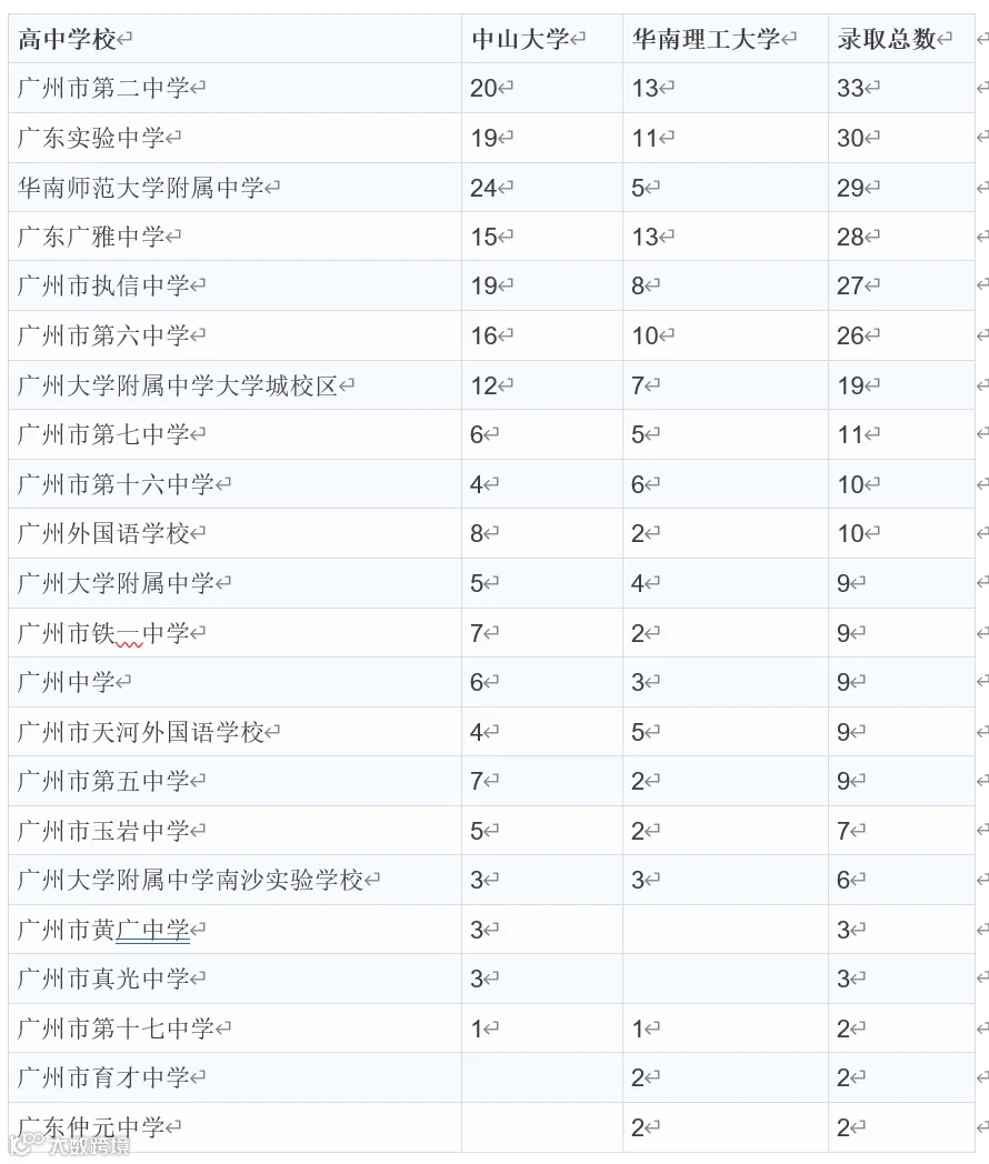 广州的高中里,二中、省实、华附、广雅、执信、六中、广大附、七中、十六中、广州外校等学校有10人以上被录取。