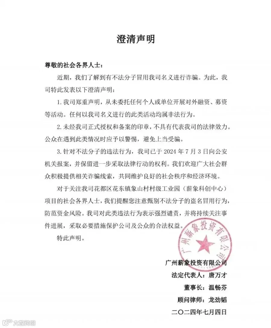 6月30日起,陆续有不明来电询问广州薪象投资有限公司是否与“薪象营”有关联,该公司第一时间澄清并无此事。