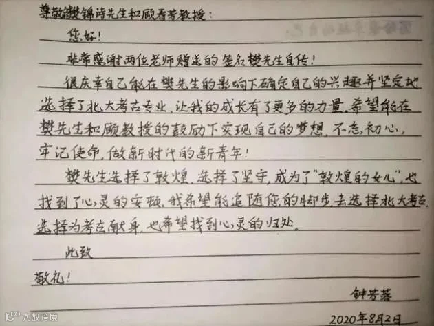 当时,钟芳蓉就表示,“樊锦诗先生给我的最大感动就是她为国家、为敦煌奉献一切。以后我应该会去敦煌旅游或者研究。”