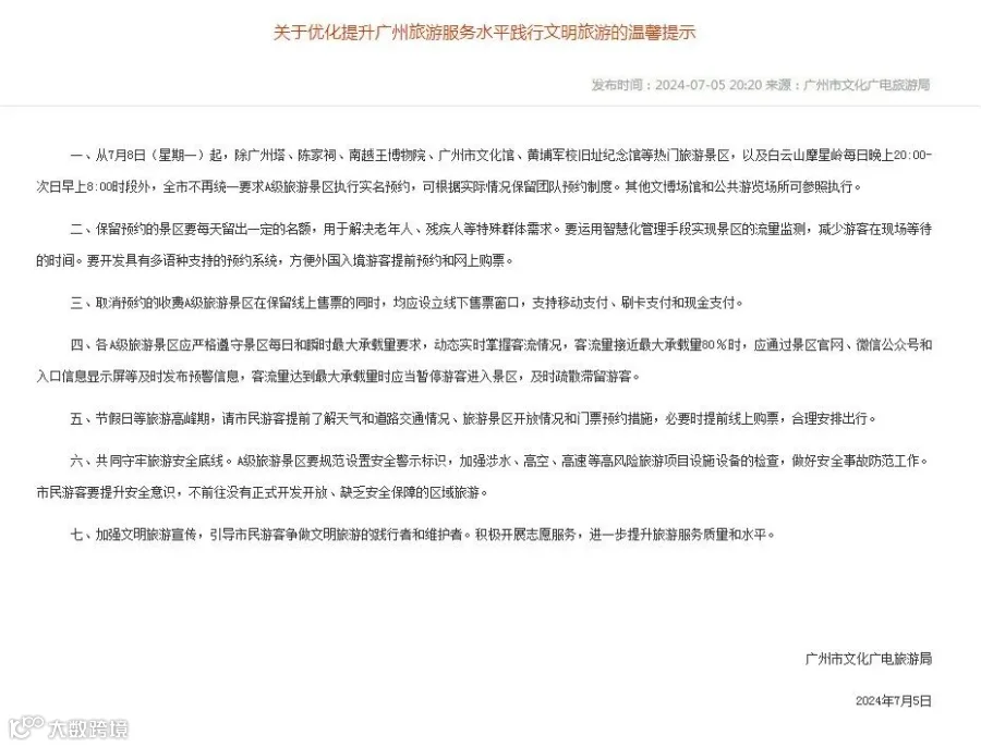 一、从7月8日(星期一)起,除广州塔、陈家祠、南越王博物院、广州市文化馆、黄埔军校旧址纪念馆等热门旅游景区,以及白云山摩星岭每日晚上20:00-次日早上8:00时段外,全市,可根据实际情况保留团队预约制度。其他文博场馆和公共游览场所可参照执行。