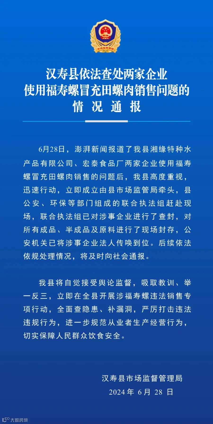 6月28日下午,湖南汉寿县市监局发布情况通报,称澎湃新闻报道了汉寿县湘缘特种水产品有限公司、宏泰食品厂两家企业使用福寿螺冒充田螺肉销售的问题后,汉寿县高度重视,迅速行动,立即成立由县市场监管局牵头,县公安、环保等部门组成的联合执法组赶赴现场,联合执法组已对涉事企业进行了查封,对所有成品、半成品及原料进行了现场封存,公安机关已将涉事企业法人传唤到位。后续依法依规处理情况,将及时向社会通报。