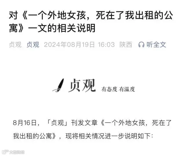 据顶端新闻报道,8月16日,微信公众号“贞观”发布《一个外地女孩,死在了我出租的公寓》一文,作者系十二橡树,其自称一宁夏女子死在自己西安的30楼出租公寓。