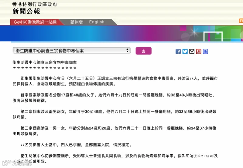 6月19日,2名顾客在香港旺角一家餐厅就餐后,约33至43小时后出现呕吐、腹泻及发烧等病征。