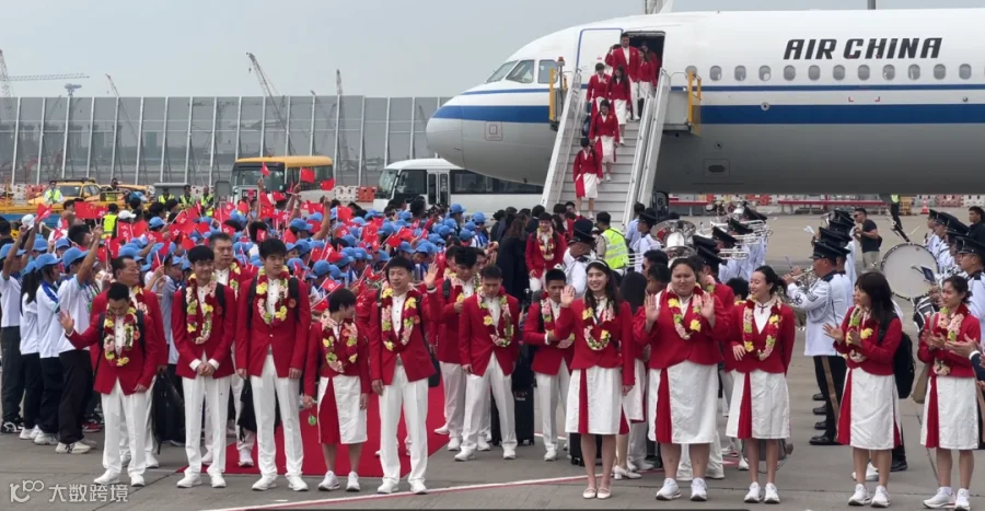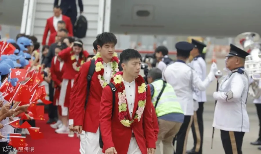 马龙、全红婵、潘展乐、张雨霏等运动员走下飞机,与大家挥手致意。
