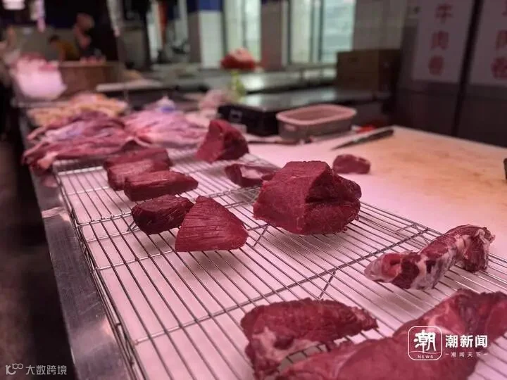 梁老板指了指摊位的优质牛肉说,像吊龙肉,以前每斤要卖六七十元,现在只卖五十多元;金钱腱之前是每斤七十多元,现在才六十元。“今年牛排价格都不如猪排贵了。”