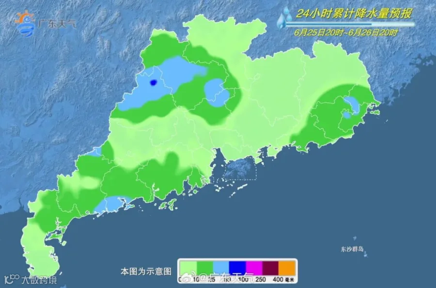 25日,珠三角、粤西、韶关和清远两市的南部有大雨到暴雨局部大暴雨,粤东沿海地区有中到大雨局部暴雨;其余市县多云,有雷阵雨局部大雨。大部市县最高气温31~34℃,中北部的个别市县35℃左右。