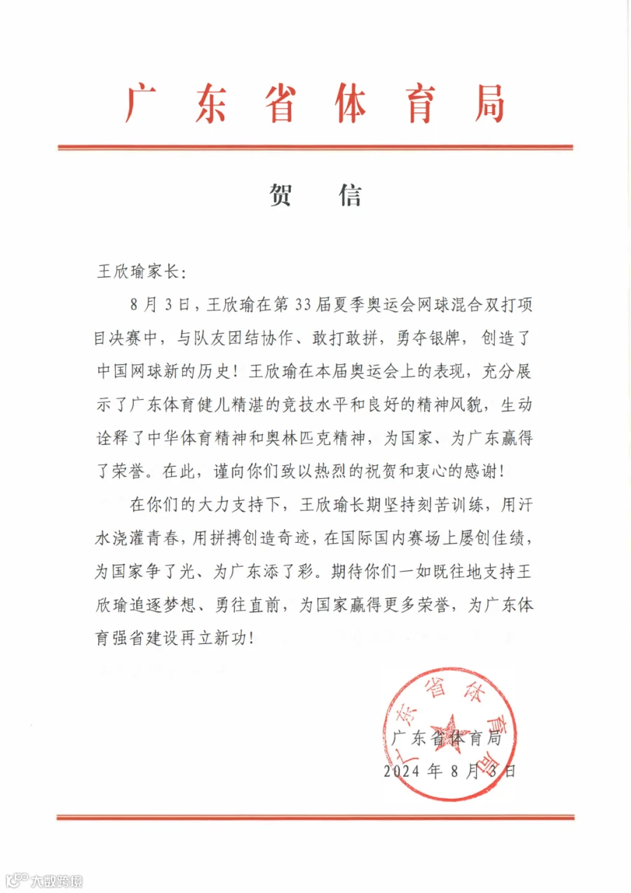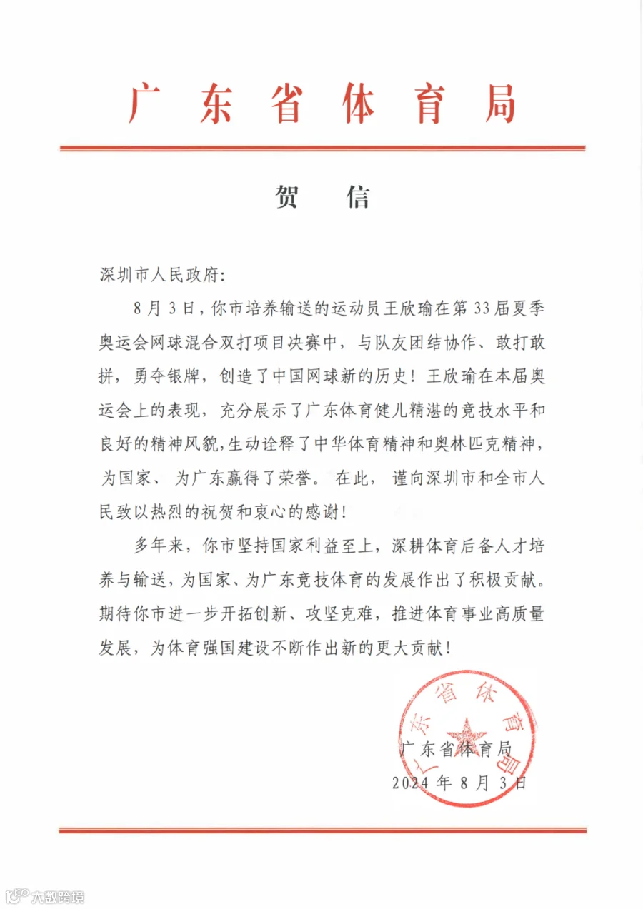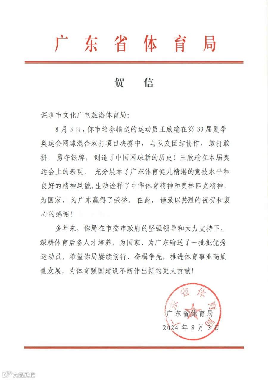 广东省体育局第一时间向深圳市人民政府、深圳市文化广电旅游体育局、王欣瑜家长发出贺信。