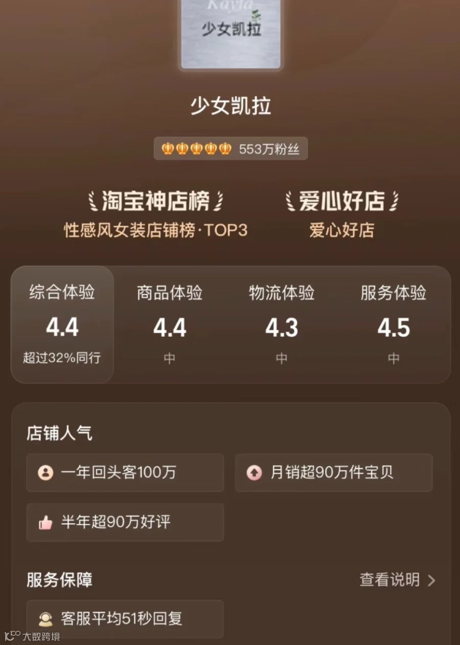 据消费者提供的截图显示,“少女凯拉”是一家女装网店,综合评分4.4分,一年内有超过100万回头客,月销超过90万件宝贝,半年超过90万条好评。在淘宝性感女装店铺榜排名前三。