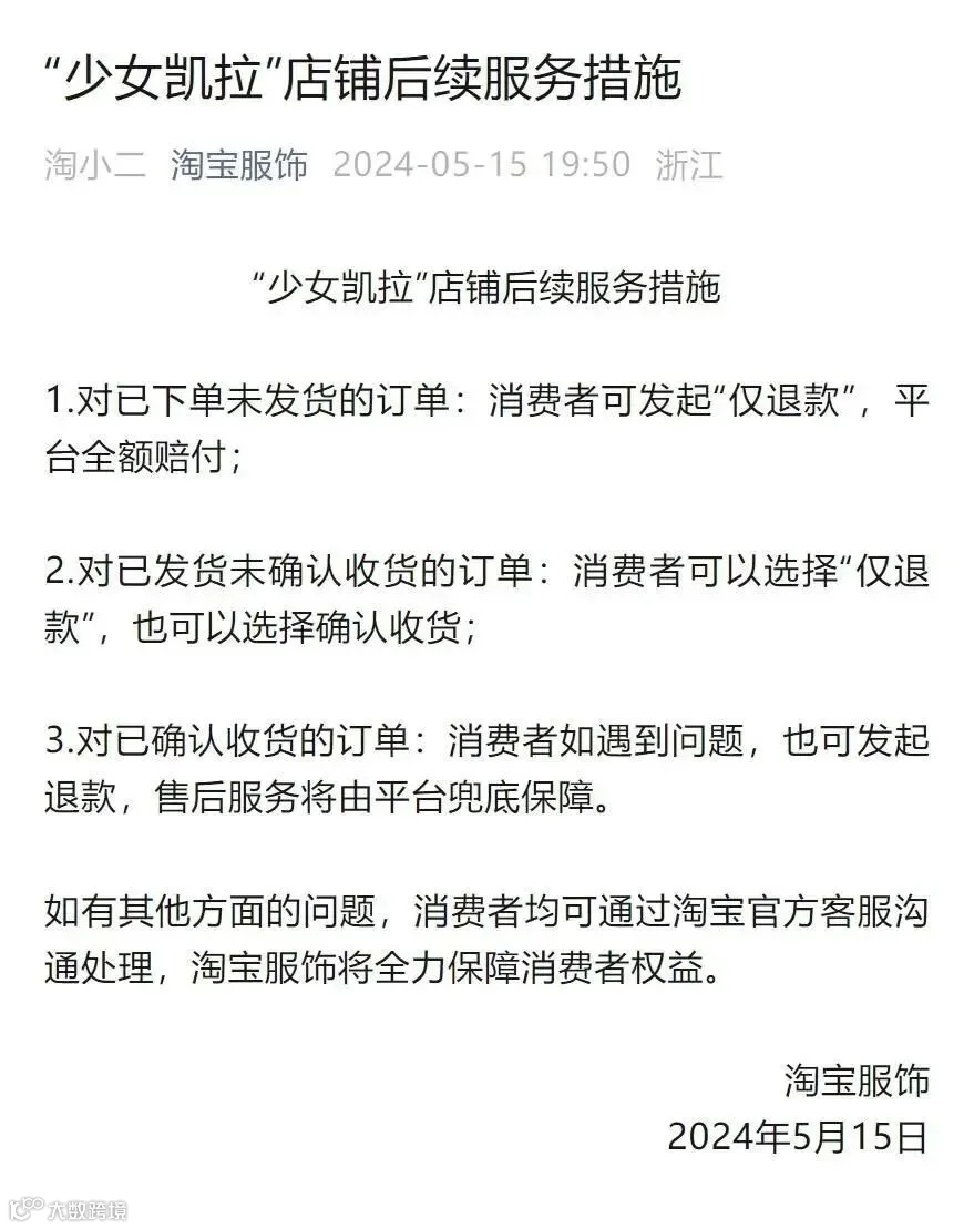 5月15日晚,淘宝服饰官方账号发布《“少女凯拉”店铺后续服务措施》,文中提到“对已下单未发货的订单:消费者可发起“仅退款”,平台全额赔付;对已发货未确认收货的订单:消费者可以选择“仅退款”,也可以选择确认收货;对已确认收货的订单:消费者如遇到问题,也可发起退款,售后服务将由平台兜底保障。如有其他方面的问题,消费者均可通过淘宝官方客服沟通处理,淘宝服饰将全力保障消费者权益。”