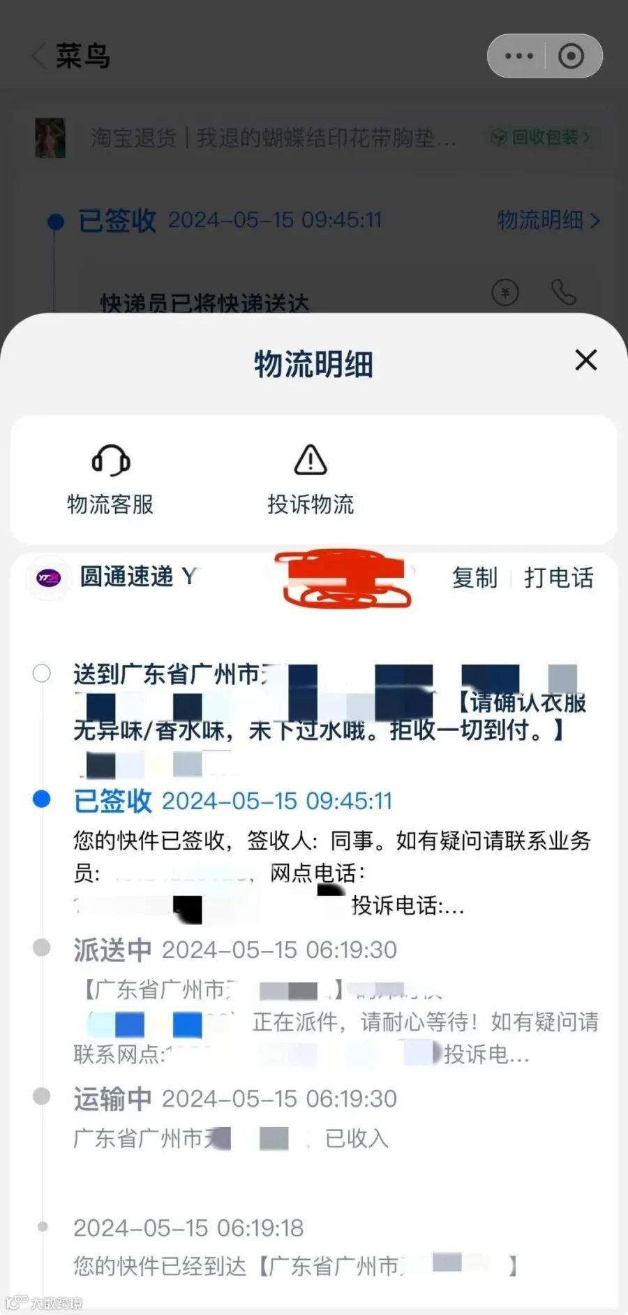 一名消费者告诉记者,她退货寄回去的衣服5月15日上午刚刚显示签收,签收人为“同事”,在快递员上门取件之后就已经收到系统的极速退款。