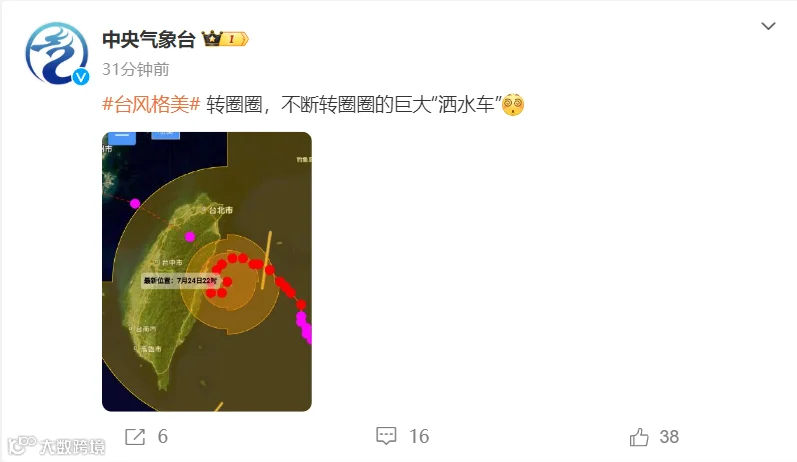 7月24日,中国气象频道气象分析师信欣发微博称,因为受台湾岛地形的影响,台风“格美”开始“掉头”兜圈子。