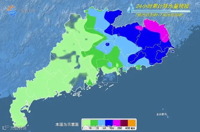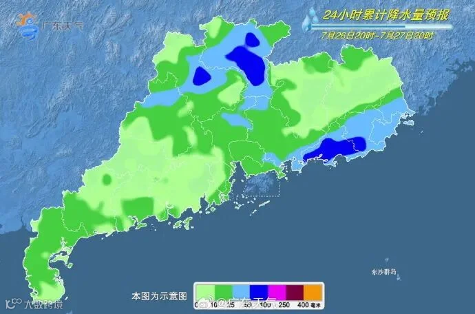 25-26日,河源、梅州、潮州、汕头、揭阳有暴雨到大暴雨,韶关、汕尾、惠州有大雨到暴雨,其余市县有(雷)阵雨局部大雨或暴雨。最高气温:清远、云浮、茂名、珠江三角洲中西部市县介于35~38℃,其余市县介于31~35℃。