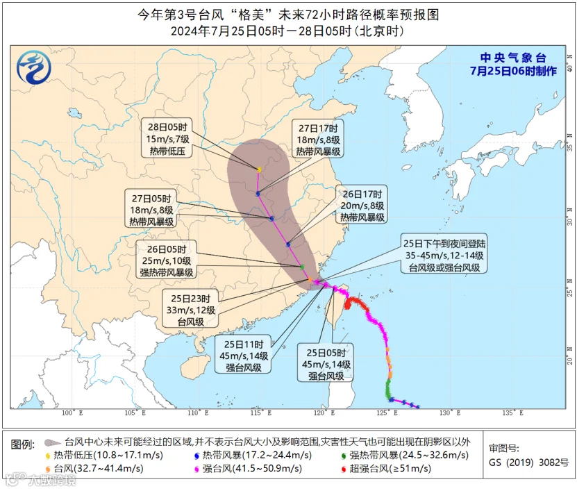 预计,“格美”将以每小时10-15公里的速度向西偏北方向移动,将于今天下午到夜间在福建秀屿到连江一带沿海登陆(台风级或强台风级,12-14级,35-45米/秒)。以后穿过福建后深入内陆,并逐渐转向偏北方向移动,强度逐渐减弱。