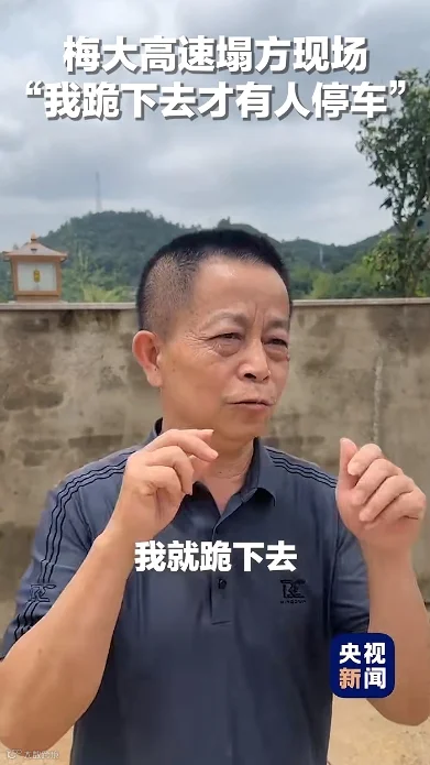 一直拼命摇手想要拦停后车的饶畛,没注意到岳父黄建度已经翻过护栏,沿着对向车道跑过塌方位置后,一边逆行一边挥手,为了截停车,黄建度甚至跪在快车道中间。