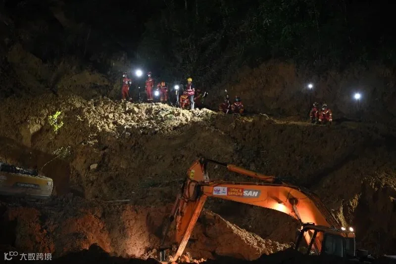5月2日晚,救援力量在广东梅大高速茶阳路段塌方灾害现场作业。新华社发
