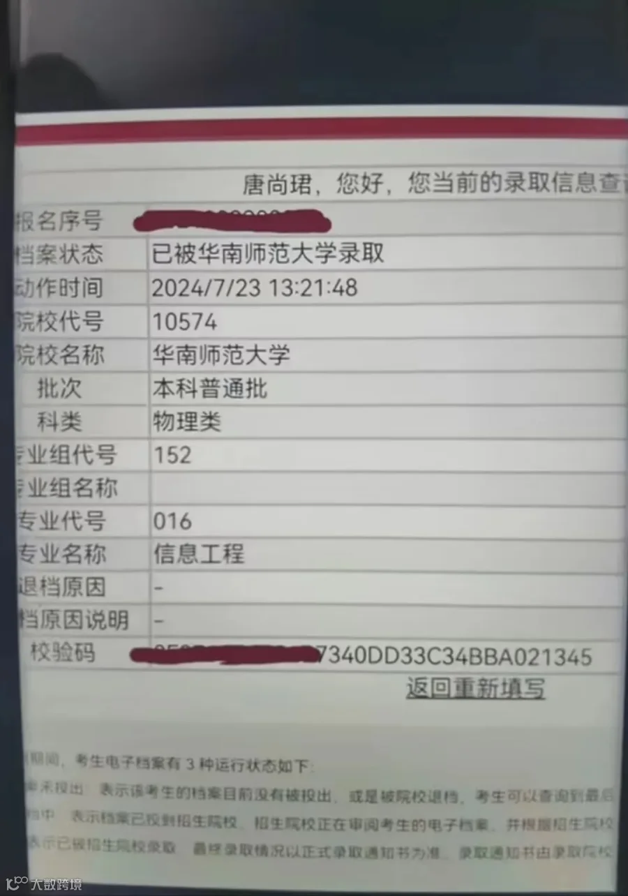 录取信息显示,当前档案状态为“已被华南师范大学录取”,批次“本科普通批”,科类“物理类”,专业名称“信息工程”。