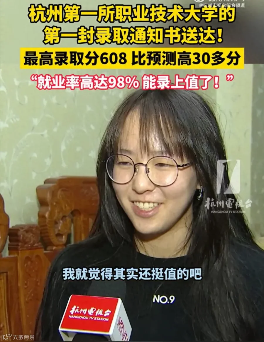 据媒体报道,今年浙江机电职业技术学院顺利“专升本”,成为杭州第一所职业技术大学。7月21日晚,学校升本后的第一封录取通知书送到了富阳考生陈雨萱家中。