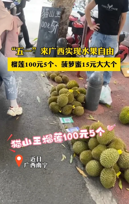 据报道,在广西最大的水果批发市场,有不少载榴莲的三轮车,车上大多为巴掌榴莲,有按个卖的,也有称斤卖的,价格都很低。巴掌榴莲,就是巴掌大小的榴莲。