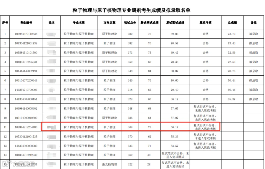 3月24日发布的《南京大学物理学院2024年硕士研究生复试录取工作细则》中,徐某某以粒子物理与原子核物理总分第一名的成绩进入复试。