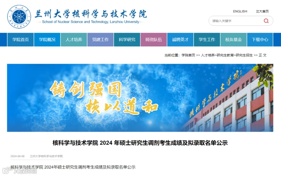 核科学与技术学院4月8日介绍,学院2024年硕士研究生招生调剂复试工作在学院招生工作领导小组的指导与监督下,经复试笔试、复试面试、思政考核等环节的严格选拔,确定了粒子物理与原子核物理、原子分子物理、放射化学、核科学与技术、能源动力-核医学物理、能源动力等各专业拟录取名单,现予以公示,公示期为2024年4月9日至4月11日。