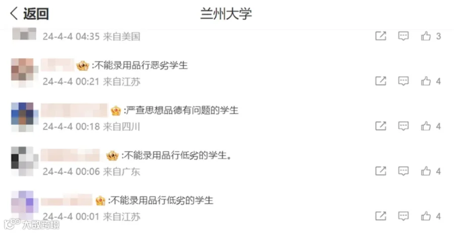 徐某某后申请调剂兰州大学。在兰州大学官微留言中,从3日开始几乎被众多网友“洗版”“刷屏”。多数网友希望兰州大学方面采取慎重态度,有网友留言:“不能录用品行恶劣学生”“德智体,德在第一”。
