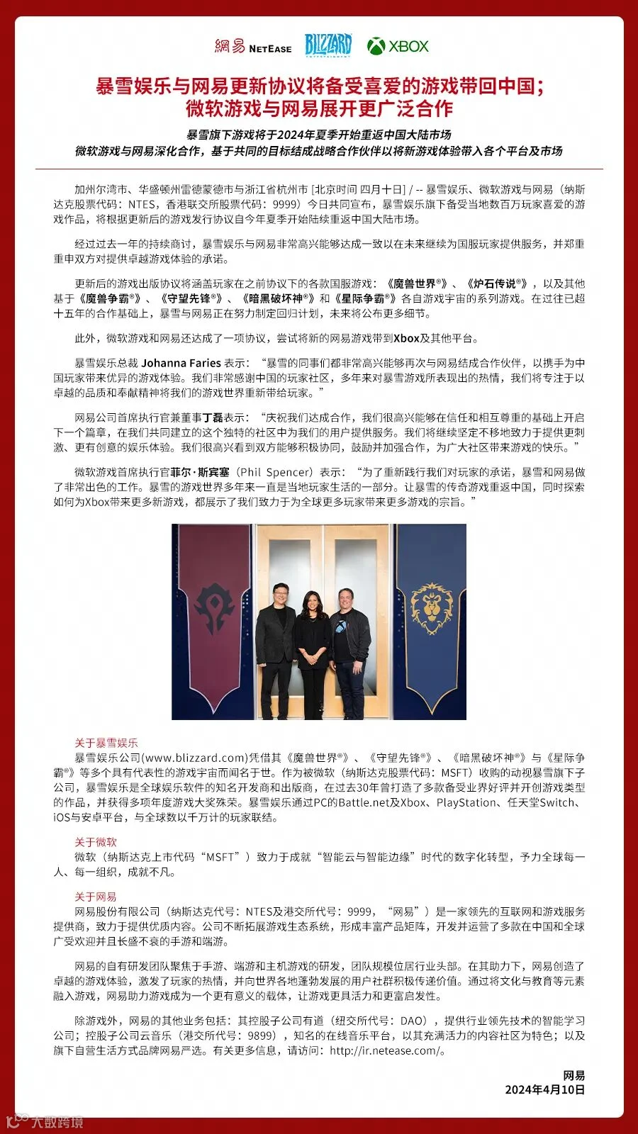 4月10日上午,@网易游戏 发文称:我们很荣幸能与暴雪娱乐再次携手,将暴雪游戏重新带回国服。