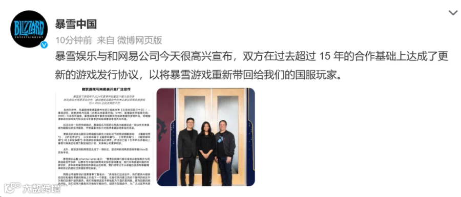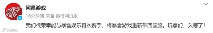 同日,@暴雪中国 发文:暴雪娱乐和网易公司今天很高兴宣布,双方在过去超过15年的合作基础上达成了更新的游戏发行协议,以将暴雪游戏重新带回给我们的国服玩家。