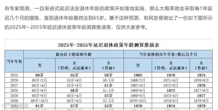 根据上述自媒体公众号文章介绍,这一结论来自于一张《退休年龄对照表及相关规定》和《2025年-2055年延迟退休政策年龄测算推演表》。这个表有官方依据吗?