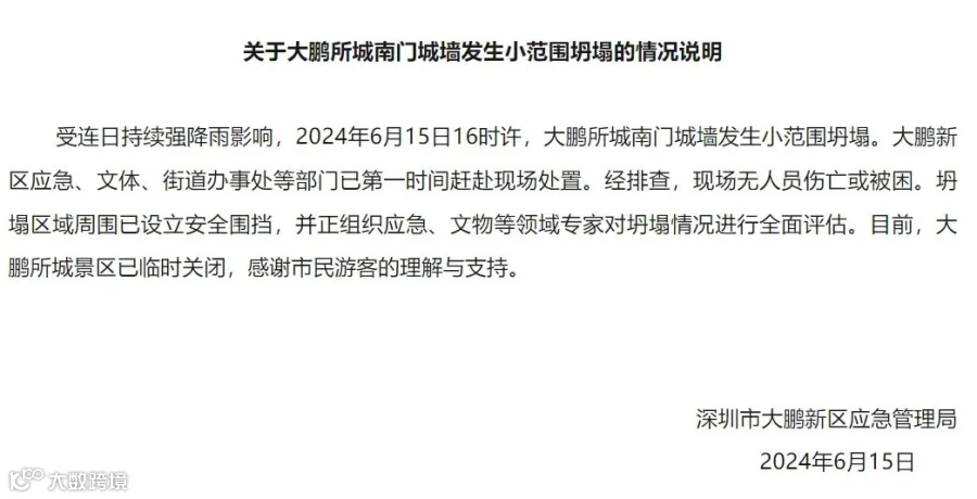 大鹏办事处相关工作人员向记者确认了大鹏所城一侧城墙坍塌一事,并表示正在处理。