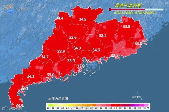 6月23日,广东大部多云,有(雷)阵雨,局部大雨到暴雨。全省大部分市县最高气温33℃~35℃,部分市县36℃~37℃。