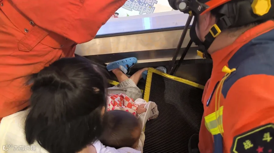 消防员到达现场发现,一名男童因穿洞洞鞋乘坐扶梯,右脚脚掌部分不慎被卡进扶梯缝隙处无法拔出。