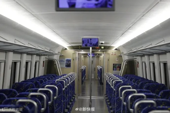 9时50分,记者从番禺站出发,搭乘广佛南环快车。进入后发现,每节车厢的一端设置了行李架,座椅为蓝底,色调清新。乘坐过程舒适、平稳。从车厢上方的显示屏来看,最高速度达183公里/小时。
