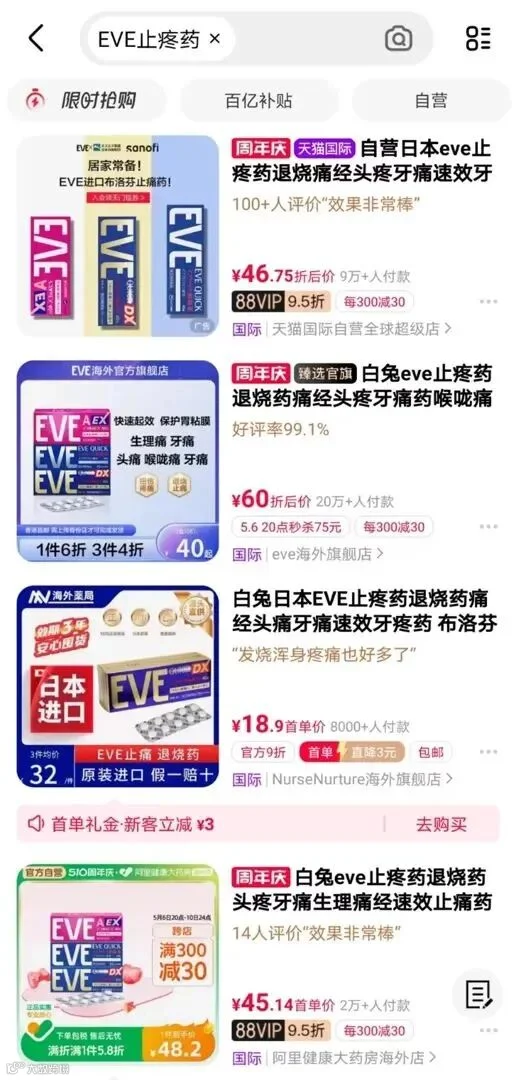 国内电商平台,EVE止疼药热销