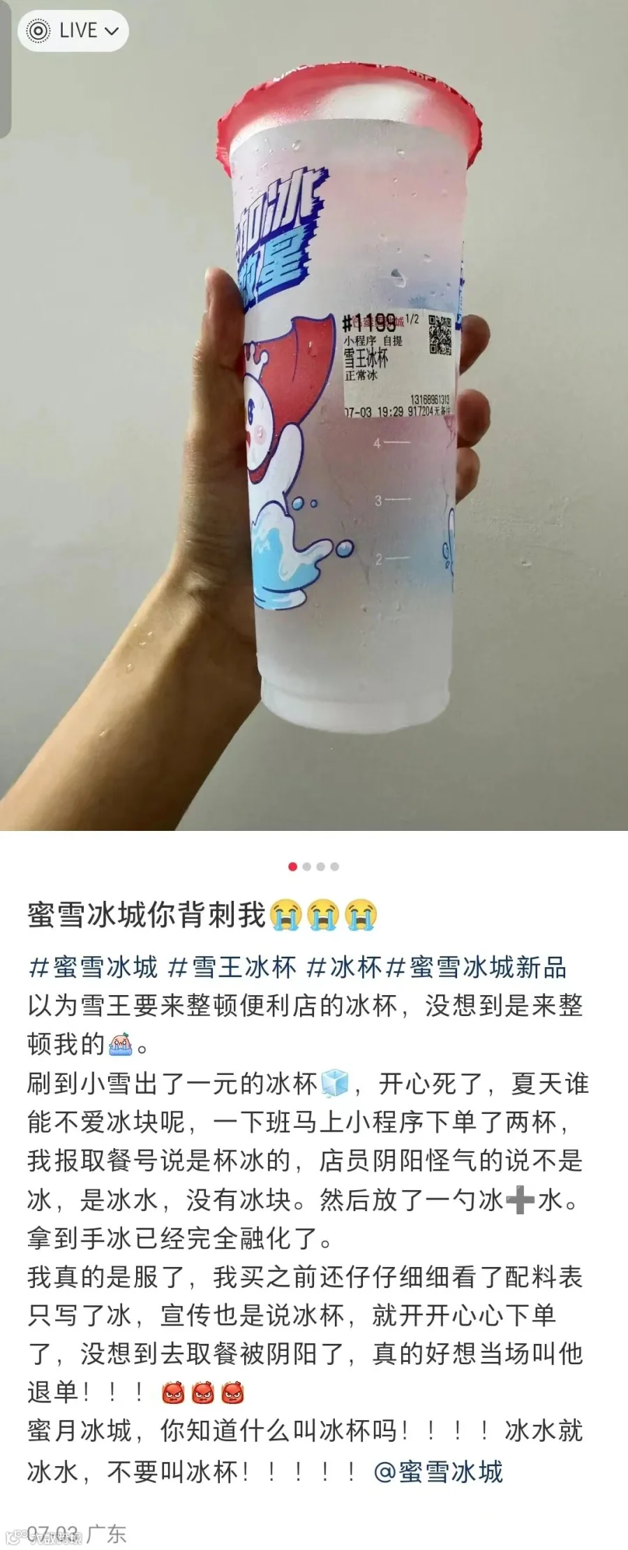 不过,“雪王冰杯”上线之后,就有多名消费者在社交平台上发帖吐槽,吐槽的地方包括在小程序上下单了冰杯却被蜜雪冰城门店退单,门店店员称没有接到通知有这款新品,店员说冰杯是亏本生意、不给做,买冰杯不给吸管等。