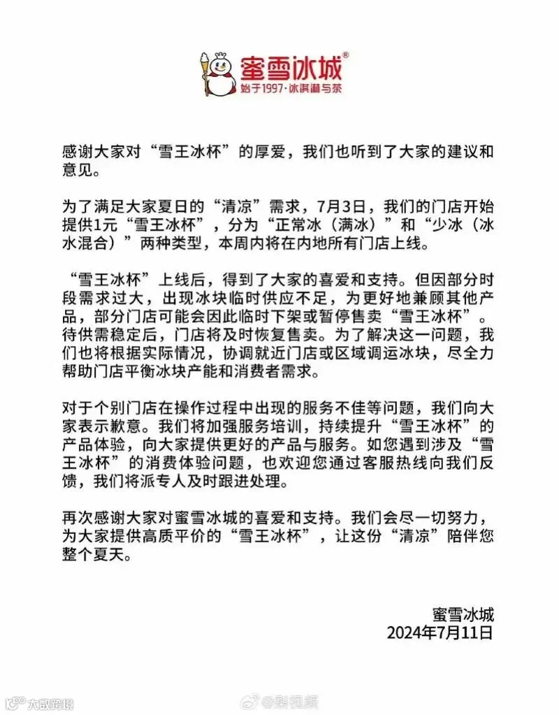 蜜雪冰城通过官方微博发布声明称,因部分时段需求过大,出现冰块临时供应不足,为更好地兼顾其他产品,部分门店可能会因此临时下架或暂停售卖“雪王冰杯”,待供需稳定后,门店将及时恢复售卖。为了解决这一问题,蜜雪冰城将根据实际情况,协调就近门店或区域调运冰块,尽全力帮助门店平衡冰块产能和消费者需求。