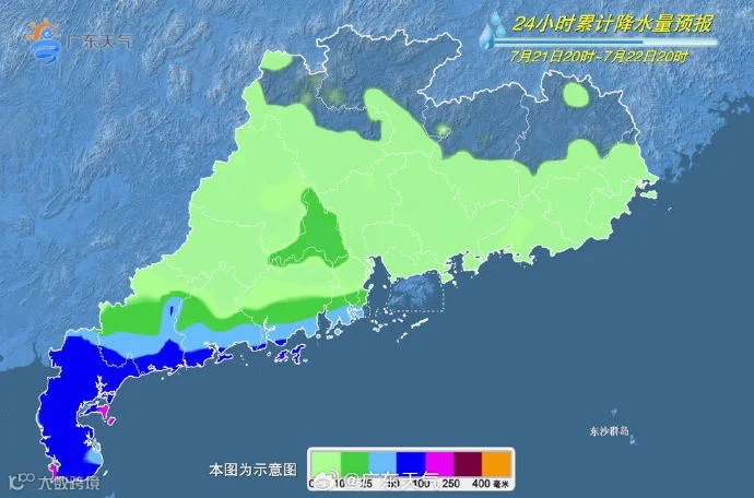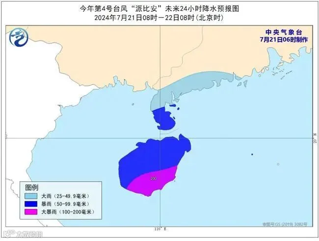 降水预报:7月21日8时至22日8时,海南岛大部、广东西部沿海有大雨或暴雨,部分地区有大暴雨(100~200毫米)。