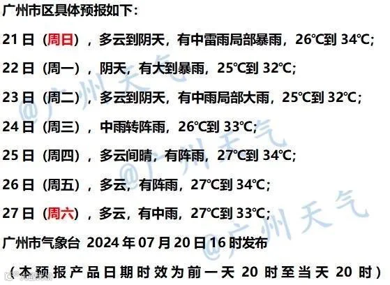 广州气象台预计,21日-22日受热带低压外围环流影响,广州市南部及西部地区有大到暴雨,其余地区有中到大雨,陆地最大阵风6~7级,港区和高地7~8级;23日-24日降雨趋于减弱。