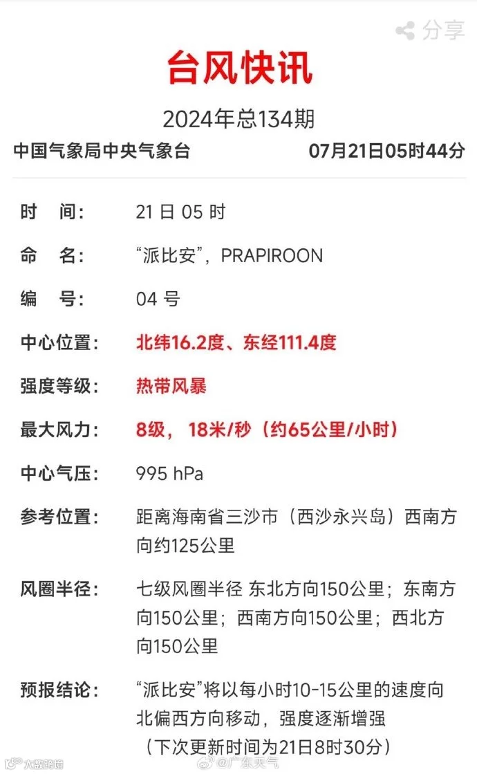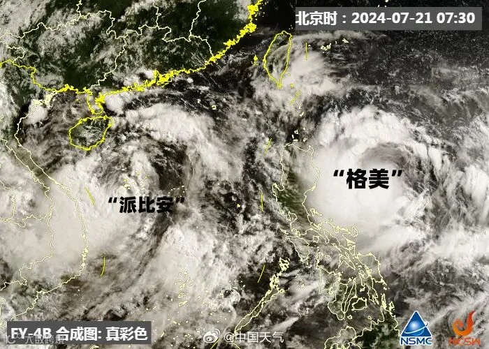 据中国天气网,7月21日5时,南海热带低压加强为今年第4号台风“派比安”(名字来源:泰国;名字意义:雨神)。至此,“派比安”和“格美”形成“双台共舞”。